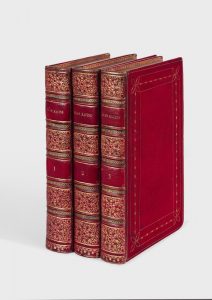 RACINE (Jean). Œuvres. Paris, Didot, 1784. 3 volumes in-8, maroquin rouge à long grain, filets et chaînettes dorés en encadrement, dos orné aux petits fers de faux-nerfs mosaïqués, dentelle intérieure, doublure et gardes de soie bleu ciel,...