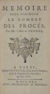SAINT-PIERRE (Charles-Irénée Castel de). Mémoire pour diminuer le nombre des procès. Paris, Chez Cavelier fils, 1725. In-12, veau fauve, dos orné, tranches rouges (Reliure de l'époque).