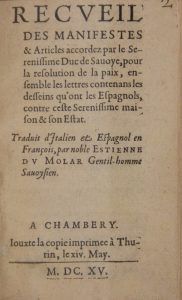 [SAVOIE (Charles-Emmanuel Ier de)]. Recueil des manifestes & articles accordez par le Sérénissime Duc de Savoye, pour la résolution de la paix, ensemble les lettres contenans les desseins qu'ont les Espagnols, contre cette Sérénissime maison &...