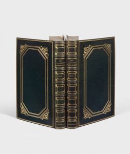 pointillés dorés orné d'un fer à l'oiseau dans les angles, dos orné, filets sur les coupes, dentelle intérieure dorée, tranches dorées sur marbrure (Chambolle-Duru).