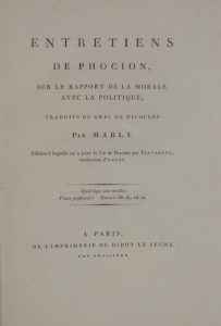 MABLY (Gabriel de). Entretiens de Phocion sur le rapport de la morale avec la politique, traduits du grec de Nicoclès par Mably. Paris, Didot le jeune, an III [1794]. In-folio, demi-maroquin à long grain noir, dos lisse orné, non rogné (Thouvenin).