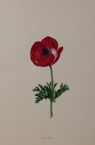 Très bel ensemble représentant un œillet ratafia, un framboisier du Canada, un groseiller sanguin, une anémone, une anémone simple, une rose mousseuse, un géranium et une ketmie.