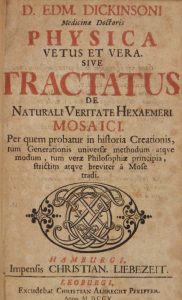 DICKINSON (Edmund). Physica vetus et vera, sive tractatus de naturali veritate hexæmeri Mosaici. Hambourg, Christian Liebezeit, 1705. In-8, demi-vélin ivoire, dos lisse, tranches rouges (Reliure du XIXe siècle).