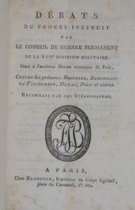[CONSPIRATION DE BROTTIER]. Débats du procès instruit par le Conseil de Guerre permanent de la XVIIe division militaire, séant à l'ancienne maison commune de Paris, contre les prévenus Brottier, Berthelot-La Villeurnoy, Dunan, Poly et autres....