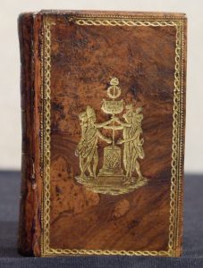Jolie reliure révolutionnaire ornée d'un rare fer doré représentant quatre gardes républicains tenant un fanion à la devise Vive la Liberté, dont la hampe, sommée d'un bonnet phrygien, repose sur un piédestal orné de fleurs de lis.