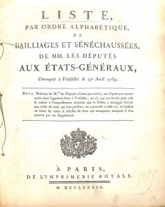 [ÉTATS-GÉNÉRAUX]. Liste par ordre alphabétique de bailliages et sénéchaussées, de MM. les députés aux États-Généraux, convoqués à Versailles le 27 avril 1789. Paris, Imprimerie Royale, 1789. In-4 de 88 pp., cousu.