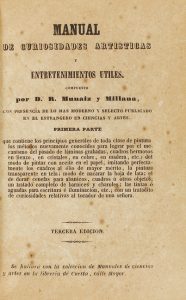 .1847. LIBRO: .[ARTE].. .MUNAIZ Y MILLANA, R.:. .MANUAL DE CURIOSIDADES ARTISTICAS Y ENTRETENIMIENTOS UTILES. PRIMERA PARTE [Y SEGUNDA PARTE, EN UN VOLUMEN]. Madrid: Imprenta de D. Antonio Yenes, 1847. 8º menor. I: VIII hojas, 270 p. + 1 h. II: VIII...