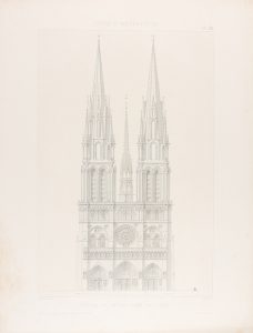 humedad en el margen interior de las primeras páginas, señales de óxido. Profus. ilustr. con grabados al boj fuera y en el texto. 2 vol. enc. en media piel rozada. Atlas: 2 h. + 38 lám., tres de ellas cromolitografiadas, todas ellas dibujadas por Viollet-le-Duc. Ténue cerco de humedad en algunas lám., restos de suciedad en algunos márgenes. Presentado en carpeta original con lomera en tela, cajo sesgado, puntas rozadas. Síntesis capital de uno de los padres de la arquitectura moderna. Brunet vol. V, col. 1262, [9700]. Presentamos completa esta publicación, rara así.