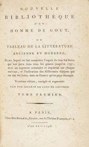 .1798-1799. LIBRO: .(BIBLIOFILIA).. .[BARBIER, ANTOINE-ALEXANDRE]:. .NOUVELLE BIBLIOTHÈQUE D´UN HOMME DE GOUT, OU TABLEAU DE LA LITTÉRATURE ANCIENNE ET MODERNE. Paris: Chez des Essarts, 1798-1799. 4 vol. 8º mayor. I: VIII + 280 p. + 2 h. II: 256...