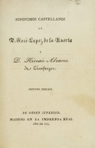 .1835. LIBRO: .(BIBLIGRAFÍA).. .LÓPEZ DE LA HUERTA, JOSÉ; NICASIO ALVAREZ DE CIENFUEGOS:. .SINONIMOS CASTELLANOS. Madrid: en la Imprenta Real, 1835. 12º. VIII h.+ 121 p. + 2 h. Enc. de la época en plena piel con hierros dorados en el plano, y...