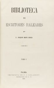 p.+ 14 h. Coserva la cubierta impresa original sobre papel amarillo. Enc. de plena piel con nervios y doble tejuelo, corte superior dorado. Exlibris grabado del Duque de T´Serclaes. Magnífico ejemplar. Edición original de esta importante obra de bio-bibliografía balear. Durante años fue obra muy buscada por la cantidad de información que contiene; se publicó una edición facsímil en 1976.