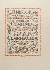 .1944.. LIBRO: .(BIBLIOFILIA).. .LA HISTORIA DEL MUY VALIENTE Y ESFORZADO CAVALLERO CLAMADES HIJO DE MARCADITAS, REY DE CASTILLA Y DE LA LINDA CLARMONDA, HIJA DEL REY DE TOSCANA. Barcelona: Ed. Mon Floris, 1944. Folio. 93 p., 2 h. Texto en orla....