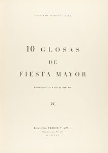 .1945.. LIBRO: .(BIBLIOFILIA).. .SABATÉ MILL, ANTONIO.. .10 GLOSAS DE FIESTA MAYOR. Ilustaciones de Pablo Boada. Vilafranca del Panadés: Ed. Verde y Azul, 1945. 28 p. + 2 h. Ilustraciones del texto coloreadas a mano. Enc. en tela edit. con tejuelo...
