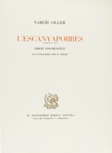 .1946.. LIBRO: .(BIBLIOFILIA).. .OLLER, NARCÍS:. .L´ESCANYAPOBRES. Barcelona: Ed. Estel, 1946. 8º mayor. XIX + 130 p. + 5 h. Con ilustr. coloreadas a mano por R. Opisso. Ejemplar de la tirada de L sobre papel de hilo Guarro, de un total de 190...