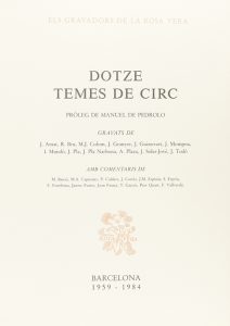 deteriorada. Grabados de: Maria J. Colom, Josep Granyer, Josep Monpou, Albert Plaza, Francesc Todó, Josep Pla Narbona, Josep Guinovart y Roser Bru. Todos los grabados y comentarios con firma autógrafa. Lleva solo ocho de los doce grabadores pero en todos hay como mínimo una prueba de estado, una prueba de la inutilización de la plancha y un estado directo del grabado, en total 32 grabados. A falta de colofón suponemos que pertenece a la edición numerada de 75 ejemplares sobre papel de hilo, en los grabados numerado II.
