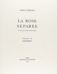 .1972.. LIBRO: .(BIBLIOFILIA).. .NERUDA, PABLO; ZAÑARTU:. .LA ROSE SÉPARÉE. Traduction de Max Clarac-Sérou. Paris: Ed. du Drago, 1972. Folio menor. 48 p. + 3 h. Ilustr. con 6 grabados a color realizados por Zañartu. En rama sobre grueso papel de...