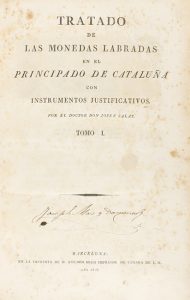 .1818. LIBRO: .(NUMISMÁTICA). .SALAT, JOSEP:. .TRATADO DE LAS MONEDAS LABRADAS EN EL PRINCIPADO DE CATALUÑA CON INSTRUMENTOS JUSTIFICATIVOS. TOMO I. Barcelona: Imp. Antonio Brusi, 1818. Folio menor. XVII + 333 p. + 8 lám. Cabecera, 7 lám....