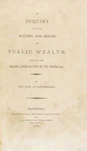 .1804.. LIBRO: .(ECONOMÍA).. .THE EARL OF LAUDERDALE [MAITLAND, JAMES]:. .AN INQUIRY INTO THE NATURE AND ORIGIN OF PUBLIC WEALTH... Edinburg: Printed for Arch. Constable & Co., 1804. 4º menor. 5 h. + 482 p. + 1 estado plegado. Las guardas, el...