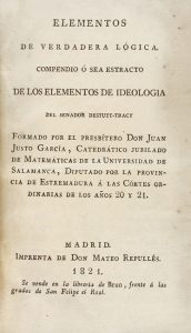 .1821.. LIBRO: .(MATEMÁTICAS).. .DESTRUTT- TRACY:. .ELEMENTOS DE VERDADERA LÓGICA. COMPENDIO Ó SEA ESTRACTO DE LOS ELEMENTOS DE IDEOLOGIA. Madrid: Imp. de Mateo Repullés, 1821. 8º. XX. + 365 p. Primeras páginas algo sucias en el margen. Enc....