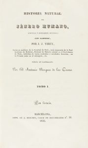 .1835. LIBRO: .(CIENCIAS NATURALES). .VIREY, J. J.:. .HISTORIA NATURAL DEL JÉNERO HUMANO. Traducción de Bergues de las Casas. Barcelona: Imp. de A. Bergnes, 1835. 3 vol. en 8º mayor. I: 437 p. + 1 h. + 6 lám. a color. II: 352 p. + 1 h. + 2 lám....