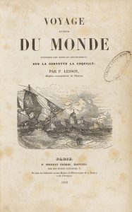.1839. LIBRO: .[BIOLOGÍA].. .LESSON, RENE PRIMEVERE:. .VOYAGE AUTOUR DU MONDE ENTREPRIS PAR ORDRE DU GOUVERNEMENT SUR LA CORVETTE LA COQUILLE. Paris: P. Pourrat Frères, Éditeurs, 1839. 2 volúmenes. 4º menor. I: Retrato del autor, Portada con...