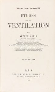.1863.. .(INGENIERÍA).. .MORIN, ARTHUR:. .ÉTUDES SUR LA VENTILATION.. Paris: Libr. L. Hachette et Cie., 1863. 2 vol. 8º mayor. I: 2 h. + III + 610 p. II: 2 h. + 407 p. + XVI lám. plegadas. Ilustr. con estados y viñetas en el texto y al final del...