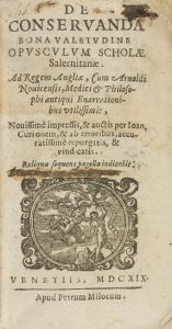 .1619.. LIBRO: .(MEDICINA).. .[VILANOVA], ARNAU:. .DE CONSERVANDA BONA VALETUDINE OPUSCULUM SCHOLAE SALERNITANAE. Venetiis: Apud Petrum Milocum, 1619. 16º. 12 h. + 271 p. + 4 p. Portada con xilografía tipográfica. Texto con apostillas marginales....