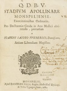 .1682. LIBRO: .(MEDICINA-FACTICIO).. .VVWBERSKI, IOANNE IACOBO:. .Q. D. B. V. STADIUM APOLLINARE MONSEPELIENSE EXERCITATIONIBUS ORDINARIIS, PRO DOCTORATUS GRADU IN ARTE MEDICA OBTINENDO PERCURSUM A... Monspelii: Apud Danielem Pech, 1682. 8º mayor. 2...
