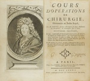 .1777.. LIBRO: .(MEDICINA-CIRUGÍA).. .DIONIS:. .COURS D´ÓPERATIONS DE CHIRURGIE, DÉMONTRÉES AU JARDIN ROYAL. Paris: Imp. d´Houri, 1777. 8º mayor. Retrato grabado + XVI + 724 p. Ilustr. con grabados xilográficos en el texto y 14 láminas fuera...