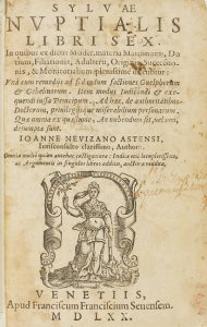 .1570.. LIBRO: .(DERECHO CANÓNICO).. .NEVIZANO ASTENSII, IOANNE:. .SYLUAE NUPTIALIS LIBRI SEX. Venetiis: Apud Franciscum Senensem, 1570. 2 vol. en 8º moenor. Vol. I: 18 h. + 288 p. Vol. II: 696 p. Portada remarginada con grabado tipográfico,...