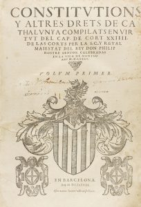 Hubert Gotard, 1588-89. 3 tomos en 1 vol. en folio mayor. 34 p. + 584 p., 34 p. [Sigue: ] PRAGMATICAS Y ALTRES DRETS DE CATHALUNYA COMPILATS EN VIRTUT DEL CAP DE CORT XXIIII (...) B.: 1589. 1 h. + 171 p., 12 p. [Sigue:] LIBRE PRIMER DE LAS CONSTITUTIONS DE CATHALUNYA SUPERFLUAS, CONTRARIAS Y CORREGIDAS. 72 p. Enc. en pergamino reciente, cortes pintados, lomera rotulada, algo corto en el margen derecho, apreciable solo en las portadas. Cada parte con portada propia y con gran escudo de Cataluña xilográfico. CCPB 285129-6. Palau 60360: ´segunda edición de este Corpus jurídico de Cataluña, que algunos denominan Usatges... Al fin del tomo primero consta que fueron impresos por Hubert Gotard, y en las portadas se señala el coste de los tres volúmenes en seis libras catalanas´.