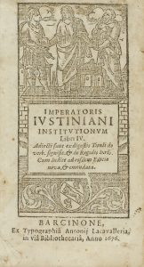 .1626.. LIBRO: .(DERECHO).. .IUSTINIANI IMPERATORIS:. .INSTITUTIONUM LIBRI IV. Adjecti sunt ex digestis Tituli de verb. signific. et de Regulis Iuris... Editio nova, et emendata. Barcinone: Imp. Antonio Lacavalleria, 1676. 12º. 432 p.+ 1 blanca....