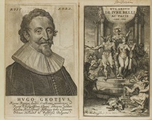 CURA. ANNOTATA IN EPISTOLAM PAULI AD PHILEMONEM, ET DISSERTATIO DE MARI LIBERO. Amstelodami: apud Joannem Blaeu, 1670. 8º mayor. 2 grabados (Retrato del autor y portada grabada) firmado ´R. De Hoogue fec. et inven.´, 3 h. (inclusive portada a dos tintas y con viñeta grabada en madera del impresor Blaeu), XVIII-620 p. , 60 h. de índices, 3 hojas, 28 p. Enc. moderna en media piel y cartoné muy bien ejecutada. Buen ejemplar. Antigua y muy buena edición que además incluye el corto tractado ´Mare Liberum sive de jure quod Batavis competit ad Indicana commercia´. Precioso el retrato de Hugo Grotius así como el frontispicio alegórico grabado por uno de los mejores artistas del siglo XVII. Esta obra está considerada como el primer tratado de derecho internacional moderno. La primera edición se publicó en Paris, 1625, y es de extraordinaria rareza. PMM 125.