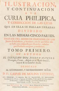 .1736-1739.. LIBRO: .(DERECHO).. .DOMINGUEZ VICENTE, JOSEPH MANUEL:. .ILUSTRACIÓN Y CONTINUACIÓN A LA CURIA PHILICA, Y CORRECCION DE LA CITAS... Tomo primero y segundo. Madrid: Oficina de los Herreros de Juan Garcia Infanzon, 1736. 2 vol. en folio...