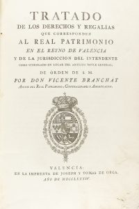 .1784-1785.. LIBRO: .BRANCHAT, VICENTE:. .TRATADO DE LOS DERECHOS Y REGALÍAS QUE CORRESPONDEN AL REAL PATRIMONIO EN EL REYNO DE VALENCIA... Valencia: en la imprenta de Joseph y Tomas de Orga, 1784. 2 vol. en folio menor, de un total de 3 vol. I: 4...