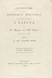 .1829.. LIBRO: .(ECONOMÍA).. .VALLE SANTORO, MARQUÉS DE:. .ELEMENTOS DE ECONOMIA POLITICA CON APLICACION PARTICULAR Á ESPAÑA.. Madrid: Imp. Ramon Verges, 1829. 8º mayor. XX + 315 p. Rústica original, pequeña pérdida en el lomo. Bien...