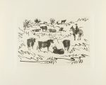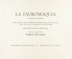 Cometa, 1980. Folio apaisado. 142 p. y 26 reproducciones de las aguatintas firmadas de Picasso presentadas en suite. En rama, petaca de tela. Edición numerada de 1500 ejemplares. Se trata del facsímil de la obra que Gustavo Gili publicó en 1959. A finales de los años cincuenta Picasso asistió a una corrida de toros de Arles y allí realizó las ilustraciones para este libro.