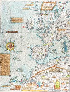 hojas de pergamino de 66 x 53 cm., iluminadas a mano por expertos miniaturistas en colores, oro y plata. Edición de 25 ejemplares numerados. Cada una de las hojas iluminadas está protegida con un marco y soporte de cartulina de PH neutro. Abraham Cresques fue un cartógrafo judío mallorquín del siglo XIV. Padre del también cartógrafo Jehuda Cresques, ambos figuras señeras de la Escuela Cartográfica Mallorquina. Realizó el Atlas Catalán [El primer Atlas del mundo] - 1375. Se realizó por encargo del rey de Aragón Joan I, para servir de obsequio al rey Carlos IV de Francia; fue entregado en París unos años después (1381) a su hijo Carlos V de Francia. Las dos primeras hojas del Atlas contienen textos y dibujos de carácter cosmográfico-astronómico, astrológico y un calendario que han sido calificados como ´de gran interés científico´. Las siguientes cuatro hojas son cuatro mapas (trazados siguiendo el sistema de rumbos marítimos) que puestos uno junto al otro darían la representación del Mundo entonces conocido. Europa, África y Asia, desde el meridiano de las islas Canarias hasta el mar de la China y desde el Trópico de Cancer, hasta aproximadamente, al paralelo 60ºN. Este Atlas es el primero que da noticia ampliada de la leyenda sobre las Islas Canarias, recientemente descubiertas por aquel entonces; un mallorquín de nombre Francesc Desvalers, zarpó de Mallorca en 1342, rumbo a las Canarias con dos cocas bayonas (muy bien reproducidas en el Atlas) regresando con dos habitantes de las visitadas islas. Debemos remarcar que el ATLAS CATALÀ es uno de los puentes que unen la cultura científica de la Edad Media con el Renacimiento, sin ser únicamente una recreación del pensamiento de Grecia y Roma, sino también el conocimiento del mundo Oriental. Como lo demuestra el Atlas, la descripción de Asia es en realidad la primera que se hace cartográficamente.
