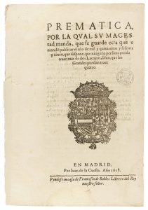 .1618. FOLLETO: .(DERECHO).. .PREMATICA POR LA QUAL SU MAGESTAD MANDA, QUE SE GUARDE OTRA QUE SE MANDÓ PUBLICAR EL AÑO DE MIL Y QUINIENTOS Y SESENTA Y CINCO, QUE DISPONE, QUE NINGUNA PERSONA PUEDA TRAER MAS DE DOS LACAYOS, SALVO, QUE LOS GRANDES...
