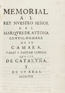 ?]: s.l., s.i., s.a., [1648]. 8º mayor. 46 fol. (numerados por error 44). Cubiertas de papel antiguo. Ejemplar sin cortar, con todas las barbas. Edición original de extrema rareza. Escribe este Memorial al Rey estando en prisión el Marqués de Aytona, a la sazón Virrey de Cataluña, por haber hecho decapitar a Antonio de la Torre, Proveedor General del Ejército en Lérida (23. de noviembre de 1647); por haberle faltado a la obediencia a raíz de un suceso con las monjas de San Hilario en Lérida.