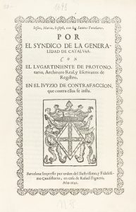 .1691.. FOLLETO: .(BARCELONA).. .POR EL SYNDICO DE LA GENERALIDAD DE CATALUÑA CON EL LUGARTENIENTE DE PROTONOTARIO, ARCHIVERO REAL, Y ESCRIVANOS DE REGISTRO. EN EL JUICIO DE CONTRAFACCIÓN QUE CONTRA ELLOS SE INSTA.. Barcelona: Imp. Rafael Figuero,...
