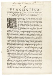 Marzo de s.i.,1717.4º mayor. 4 fol. Letra capital xilográfica. Firma autógrafa del seceretario-escrivano del Ayuntamiento de Segovia, Gaspar Quirós. Rara reedición de la Pragmática sobre la Cría de Caballos dada por Carlos III, y mandada reimprimir por Felipe V; esta en Segovia.