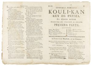 partes conservadas en ´formas´, es decir en hojas sin plegar ni cortar. Rarísima y probablemente primera edición en lengua española de las dos partes de esta comedia sobre el rey de Persia, Thamas Kouli-Kan, asesinado por sus oficiales. La escena transcurre en Hispaham y sus alrededores. Solo se conserva un ejemplar en bibliotecas públicas de España (Real Academia Española).