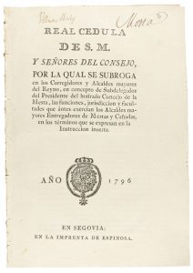 FACULTADES QUE ANTES EXERCIAN LOS ALCALDES MAYORES ENTREGADORES DE MESTAS Y CAÑADAS, EN LOS TERMINOS QUE SE EXPRESAN EN LA INSTRUCCIÓN INSERTA. DADA EN SAN ILDEFONSO A 29 DE AGOSTO DE 1796. SEGOVIA A 10 DE DICIEMBRE DE 1796. Segovia: En la Imprenta de Espinosa, 1796. 4º menor. 26 p. + 1 hoja blanca. Escudo de armas grabado en madera en la portada. Magnífico ejemplar. Rara edición publicada el mismo año que la primera. Contiene la Instrucción formada en XLIII artículos. No en Palau esta edición.
