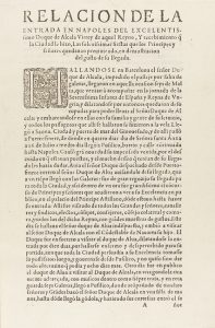 .1629. FOLLETO: .(PERIODISMO).. .RELACIÓN DE LA ENTRADA EN NAPOLES DEL EXCELENTISSIMO DUQUE DE ALCALÁ VIRREY DE AQUEL REYNO, Y RECEBIMIENTO QUE LA CIUDAD LE HIZO, LAS SOLENISSIMAS FIESTAS QUE LOS PRINCIPES Y SEÑORES QUEDAVAN PREVINIENDO, EN...