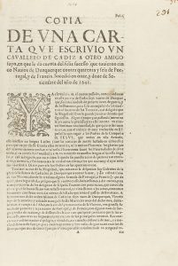 ONZE DE SETIEMBRE DE 1641. AL FINAL: CADIZ 18 DE SETIEMBRE DE 1641. s.l.:n.i.,1641. 4º mayor. 4 p. en un pliego de dos hojas. Letra capital xilográfica. Texto a línea tirada, 54 y 48 líneas. IMPRESO DESCONOCIDO. COMBATE DEL CABO DE SAN VICENTE 1641.- Relata el combate que tuvieron en aguas del Cabo de San Vicente 6 navíos de Dunquerque que estaban al mando del general Judoco Pieters y debajo de las ordenes de la armada española contra 46 navíos de Portugal; esto sucedió mientras se disponían los Galeones de la plata salir de Cádiz. ´Llegose en este tiempo a nosotros la almiranta de Portugal, que era una poderosa nao de la India con tres ordenes de artilleria a cda lado, y bien serian quatrocientos mosqueteros, como infinita canalla de gente [...] pero respondimos con los cañones de nuestra artilleria, que llenos de balas de mosquetes (según fue el orden de nuestro Almirante Salvador Rodriguez, soldado veterano, y de los buenos que an tenido los mares en estos tiempos) les embiamos tan gentil roziada de plomo, que en un instante se vino la Carraca Portuguesa sin su gente, sin su Chritiandad, y sin consejo otro, que el desayrado de huir a tiempo que la Capitana de Francia avia desesperado de la vitoria retirandose [...]´. El relato es tan literario que parece sacado de una novela de Patrick O´brian. Desconocido de las bibliografías consultadas y ningún ejemplar conocido en Bibliotecas Públicas.