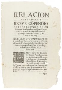 .1683. FOLLETO: .[PERIODISMO].. .RELACIÓN VERDADERA, Y BREVE COMPENDIO DE TODO LO SUCEDIDO EN ALEMANIA, SACADO DE LO QUE EL SEÑOR EMPERADOR A ESCRITO A SU MAGESTAD CATOLICA, QUE LLEGO A LA CORTE, SABADO 23 DE OCTUBRE D 1683. REFIERESE TODO LO QUE...