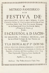 .[1737]. FOLLETO: .(NOBILIARIA).. .BALAGUER Y PERELLÓ, JACINTO:. .METRICO PANEGÍRICO A LA FESTIVA DEMONSTRACION, QUE LA MUY NOBLE, Y LEAL CIUDAD DE PALMA, HA CONSAGRADO A SU PATRICIO EL EMINENTÍSSIMO SEÑOR FRAY DON RAYMUNDO DEZPUIG EN SU CREACION...