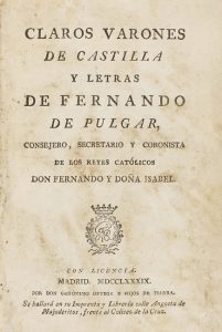 .1789. LIBRO: .(GENEALOGÍA).. .PULGAR, FERNANDO DE:. .CLAROS VARONES DE CASTILLA Y LETRAS DE FERNANDO DE PULGAR, CONSEJERO, SECRETARIO Y CORONISTA DE LOS REYES CATÓLICOS DON FERNANDO Y DOÑA ISABEL. Madrid: Por Don Gerónimo Ortega e Hijos de...