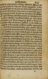 CONTIENEN QUARENTA MILAGROS HECHOS / POR VIRTUD DEL SANTO ROSARIO, AGORA / NUEVAMENTE AÑADIDOS POR EL / MESMO AUCTOR. // (AL FOLIO CLXXIXV): FIN DE LA SEGUNDA PARTE DE LOS MI/LAGROS AGORA NUEVAMENTE AÑA / DIDOS. //. [Barcelona, post 1552].[desconocida]1552. 8º menor. Tipos góticos de dos tamaños, texto a línea tirada. Letras capitales xilográficas. Empieza en el folio LI (sign. n), termina en el folio CLXXIX. = 128 folios. Signaturas n-z8, &8, A-D8. Encuadernación moderna (c. 1950) en pergamino a la romana. ÚNICO EJEMPLAR DE UNA EDICIÓN DESCONOCIDA. Edición desconocida pero probablemente de las impresas en México después de 1552. Se conoce un fragmento impreso en [Valencia] 1554, de parecidas características pero signaturas diferentes. También una edición de México, Pedro Balli, 1576, impresa en tipos romanos, pero entre estas dos se suponen otras que bien pueden estar impresas en otros lugares. Los ejemplares conservados son siempre fragmentos. El estilo de los relatos milagrosos entra de lleno en la literatura popular de carácter amoroso, ya que casi todos ellos son protagonizados por mujeres y lances de amor. El autor publicó en lengua catalana por vez primera este texto en Barcelona 1556, y le siguieron innumerables ediciones en los tres siglos siguientes. Muchos de los milagros descritos ocurren a personas de lugares de Cataluña (Lérida, Balaguer, Puigcerdá, etc). Termina la obra en el folio CLXXIX, que contiene el último capítulo de los milagros, y nos da la fecha más cercana a esta impresión: Capitulo XLII. De una mu/jer librada de un falso testimonio, y de la mu/erte por virtud del santo rosario. En el año de mil quinientos cin/quenta y dos, en la ciudad de Ba/laguer una buena mujer […].